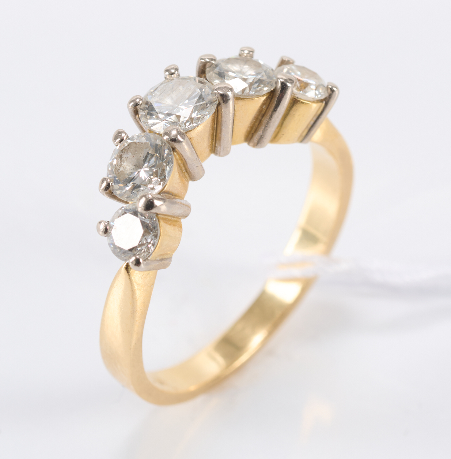 A FIVE STONE DIAMOND RING TOTALLING 1.38CTS, IN 18CT GOLD, RING SIZE P