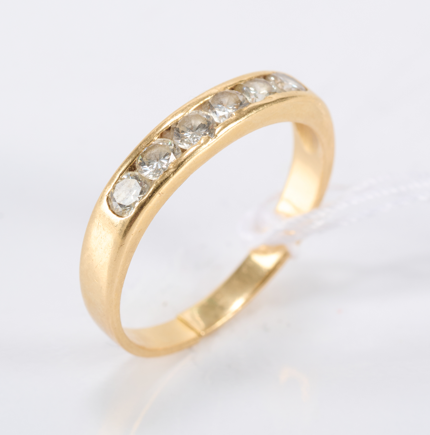 A SIX STONE DIAMOND RING IN 18CT GOLD, RING SIZE O - P, AF (SPLIT IN BAND)