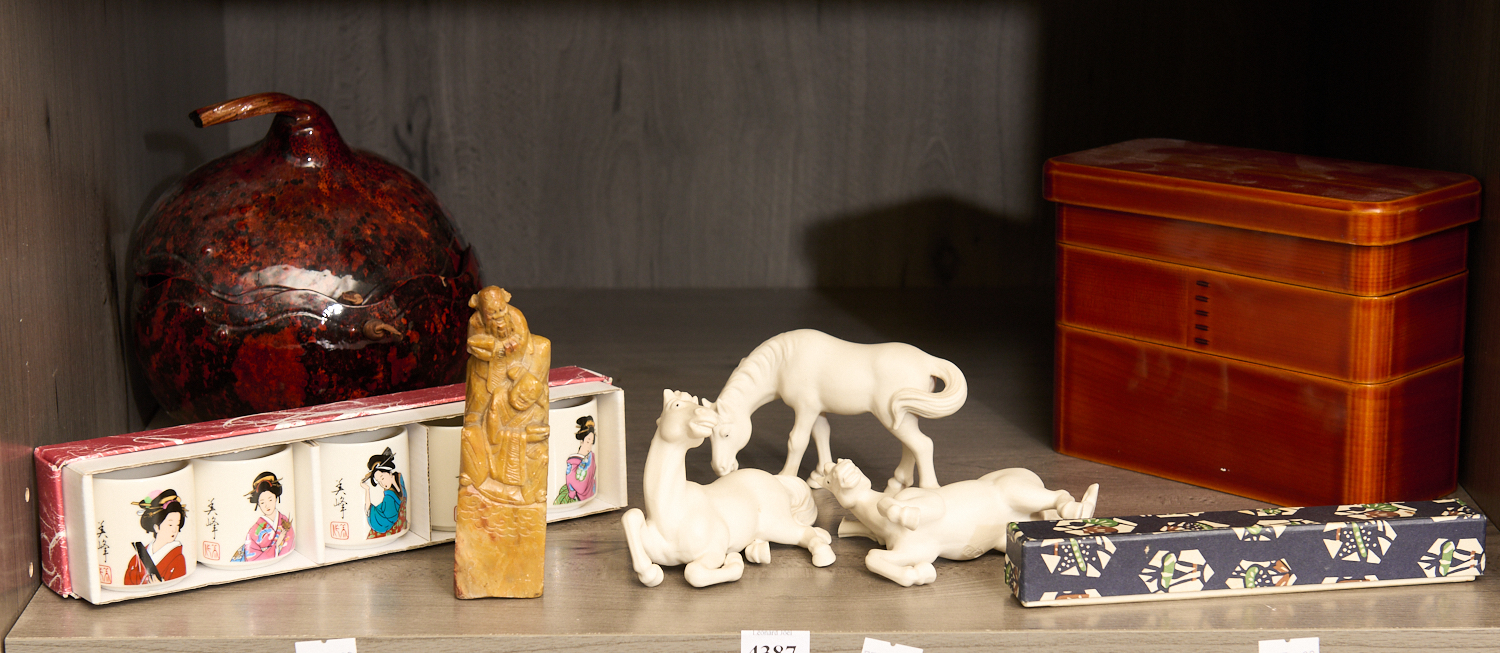 A SHELF OF ASSORTED ASIAN ITEMS, LEONARD JOEL LOCAL DELIVERY SIZE: SMALL