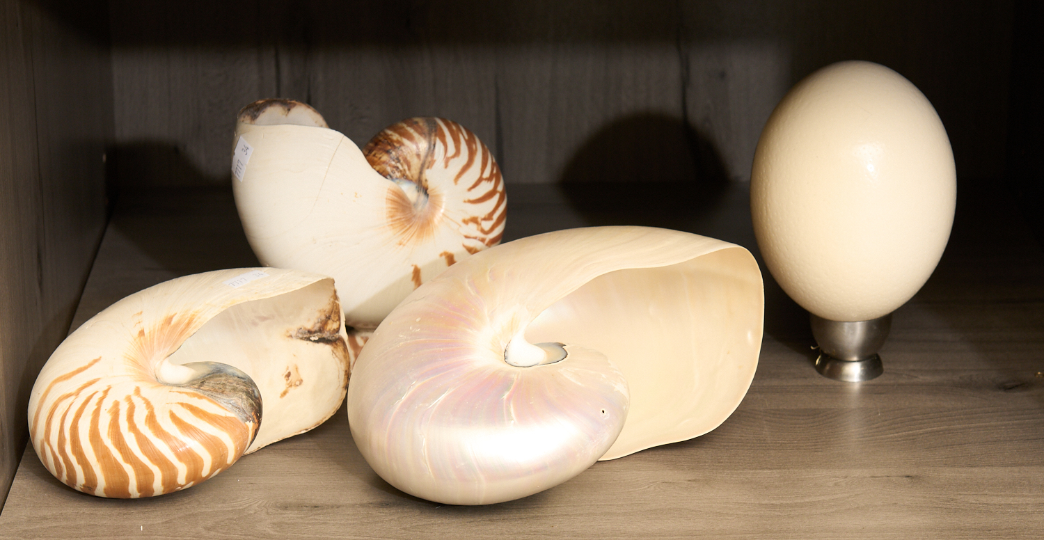 THREE NAUTALIS SHELLS TOGETHER WITH AN EGG, LEONARD JOEL LOCAL DELIVERY SIZE: SMALL