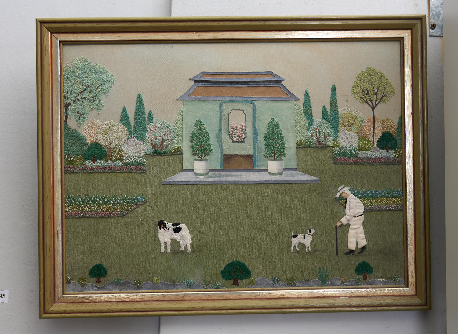 A FRAMED EMBROIDERY H.39.5CM X W.51.5CM, LEONARD JOEL LOCAL DELIVERY SIZE: SMALL