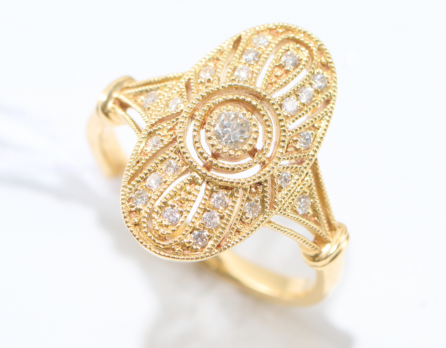 A DIAMOND OVAL FILIGREE CLUSTER RING IN 18CT GOLD, RING SIZE M/N, 4.44GMS