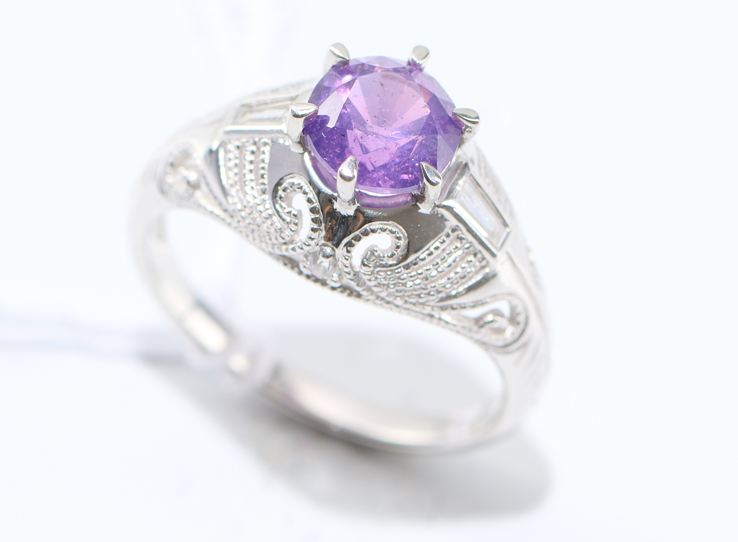 A UNHEATED PURPLE SAPPHIRE AND DIAMOND DRESS RING IN PLATINUM, FEATURING A CENTRAL ROUND BRILLIANT SAPPHIRE WITH BAGAUETTE CUT DIAMOND SHOULDERS, RING SIZE N