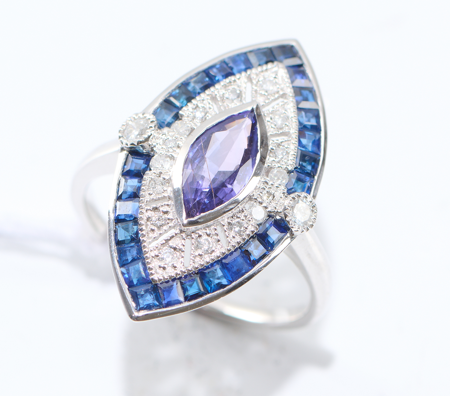 A MARQUISE CUT PURPLE SAPPHIRE, BLUE SAPPHIRE AND DIAMOND CLUSTER RING IN 18CT WHITE GOLD, RING SIZE N