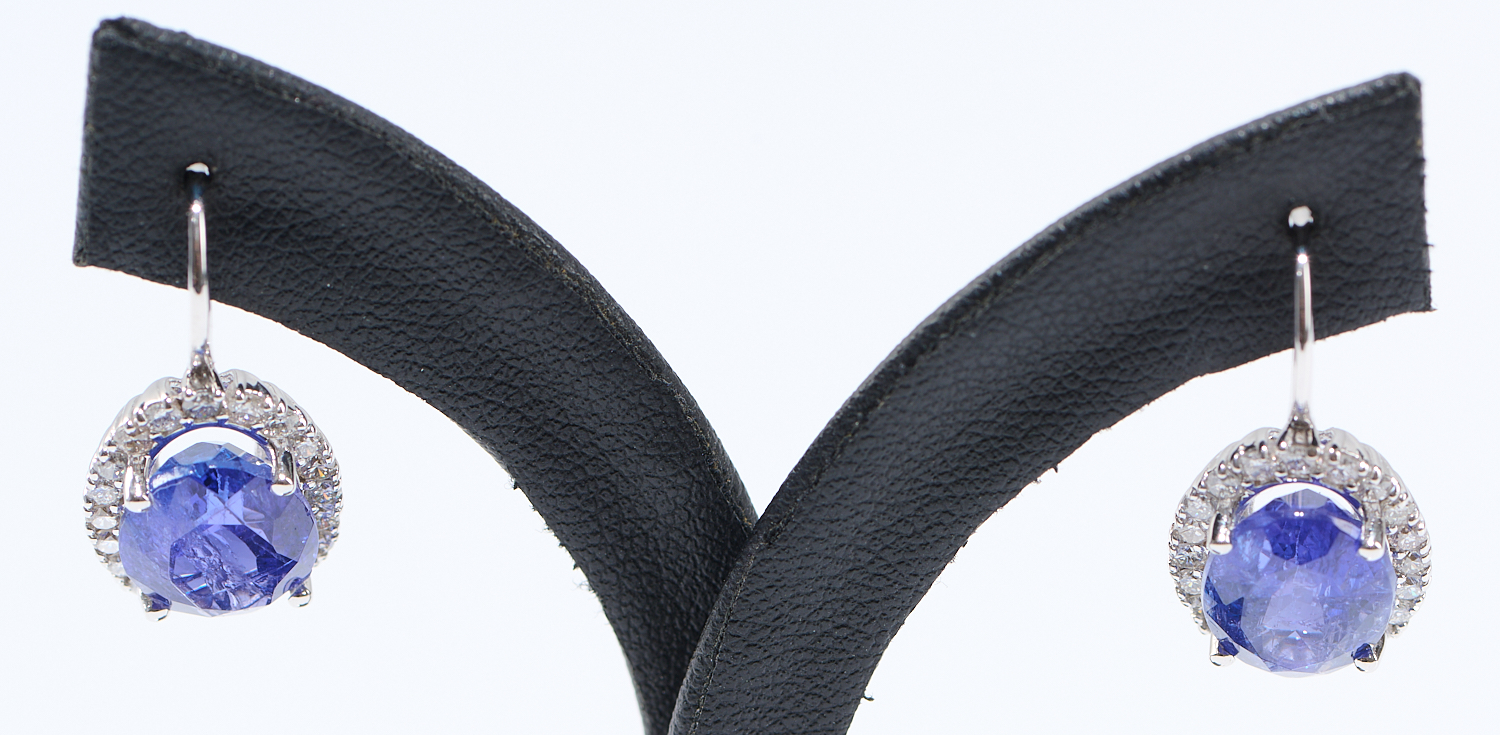 A PAIR OF TANZANITE AND DIAMOND EARRINGS IN 18CT WHITE GOLD, TO HOOK FITTINGS, THE EARRINGS MEASURING APPROXIMATELY 15.04 X 11.47MM