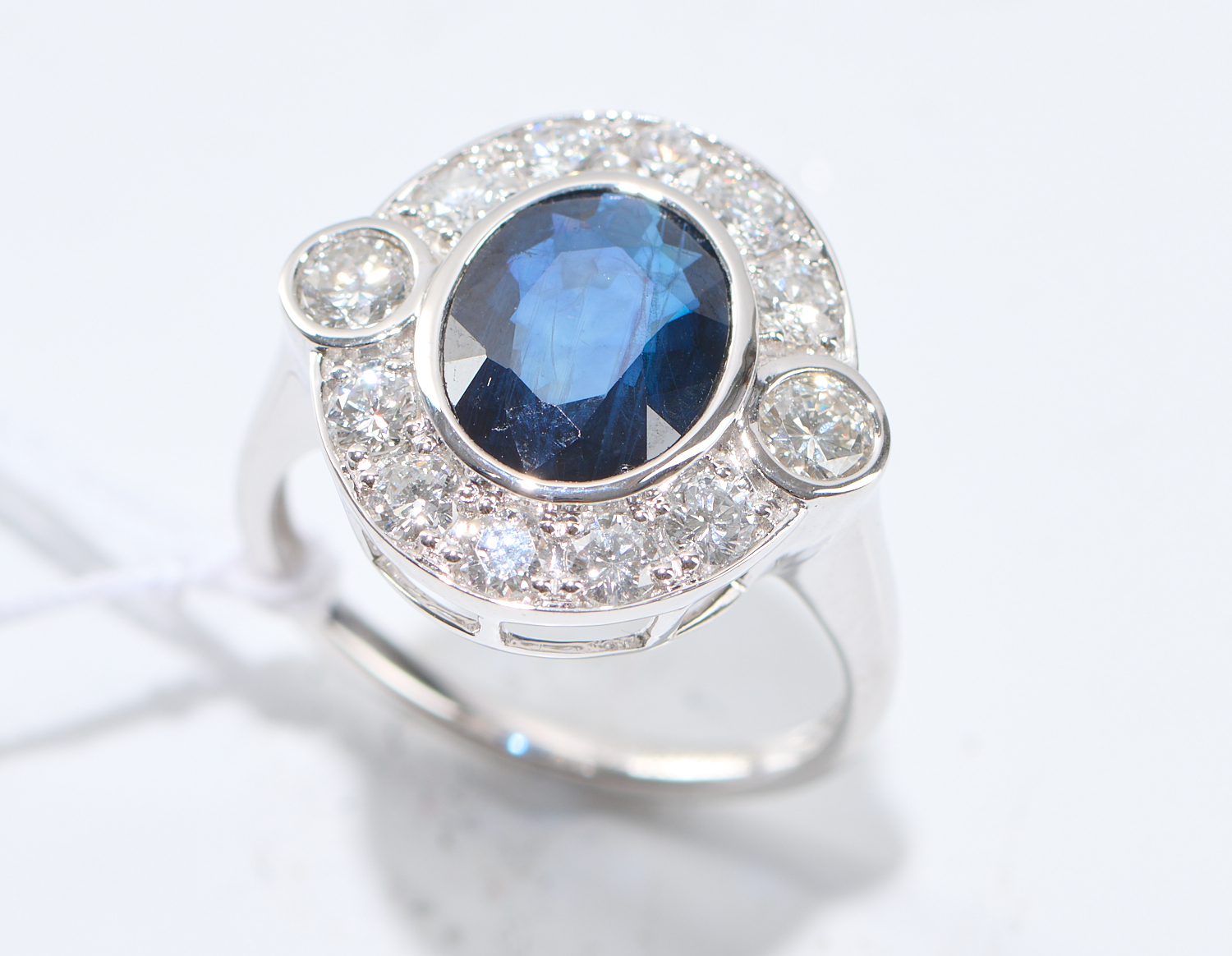 A SAPPHIRE AND DIAMOND CLUSTER RING IN 18CT WHITE GOLD, THE SAPPHIRE TOTALLING 2.18CTS, RING SIZE M