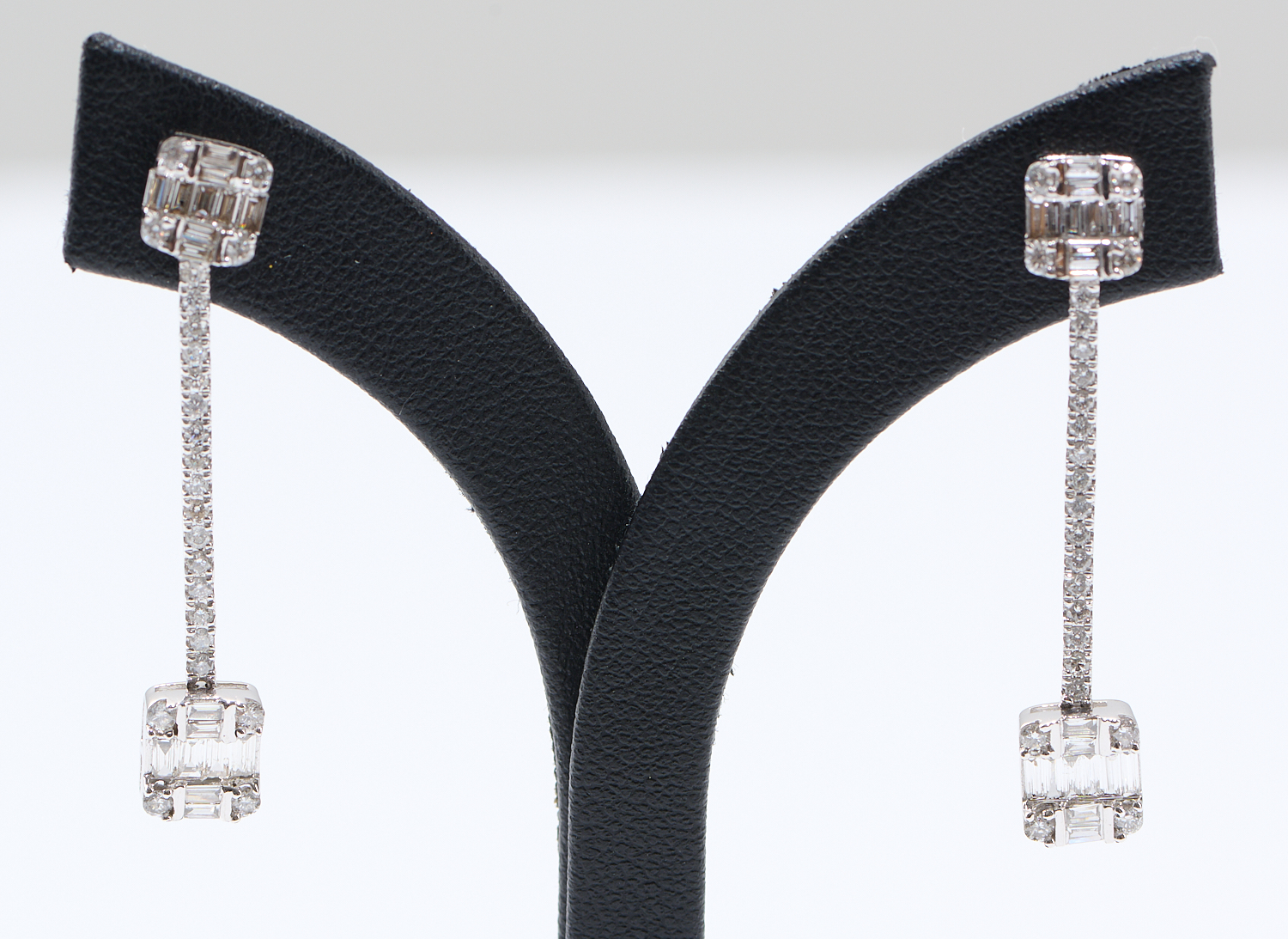A PAIR OF DIAMOND DROP EARRINGS IN 18CT WHITE GOLD, TO POST AND BUTTERFLY EARRINGS, TOTAL DROP APPROXIMATELY 37MM