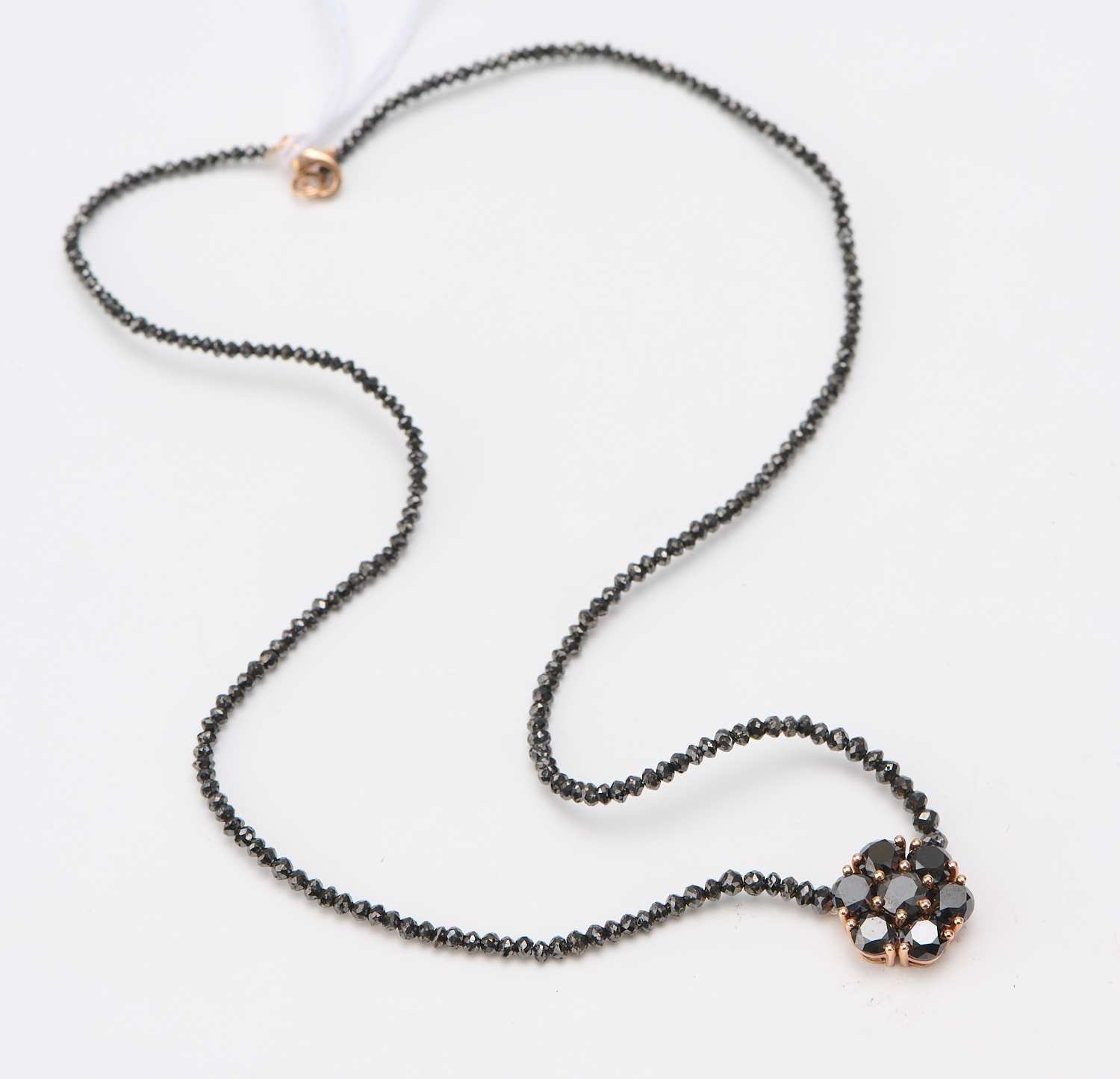 A BLACK DIAMOND PENDANT IN 18CT ROSE GOLD, LENGTH APPROXIMATELY 400MM