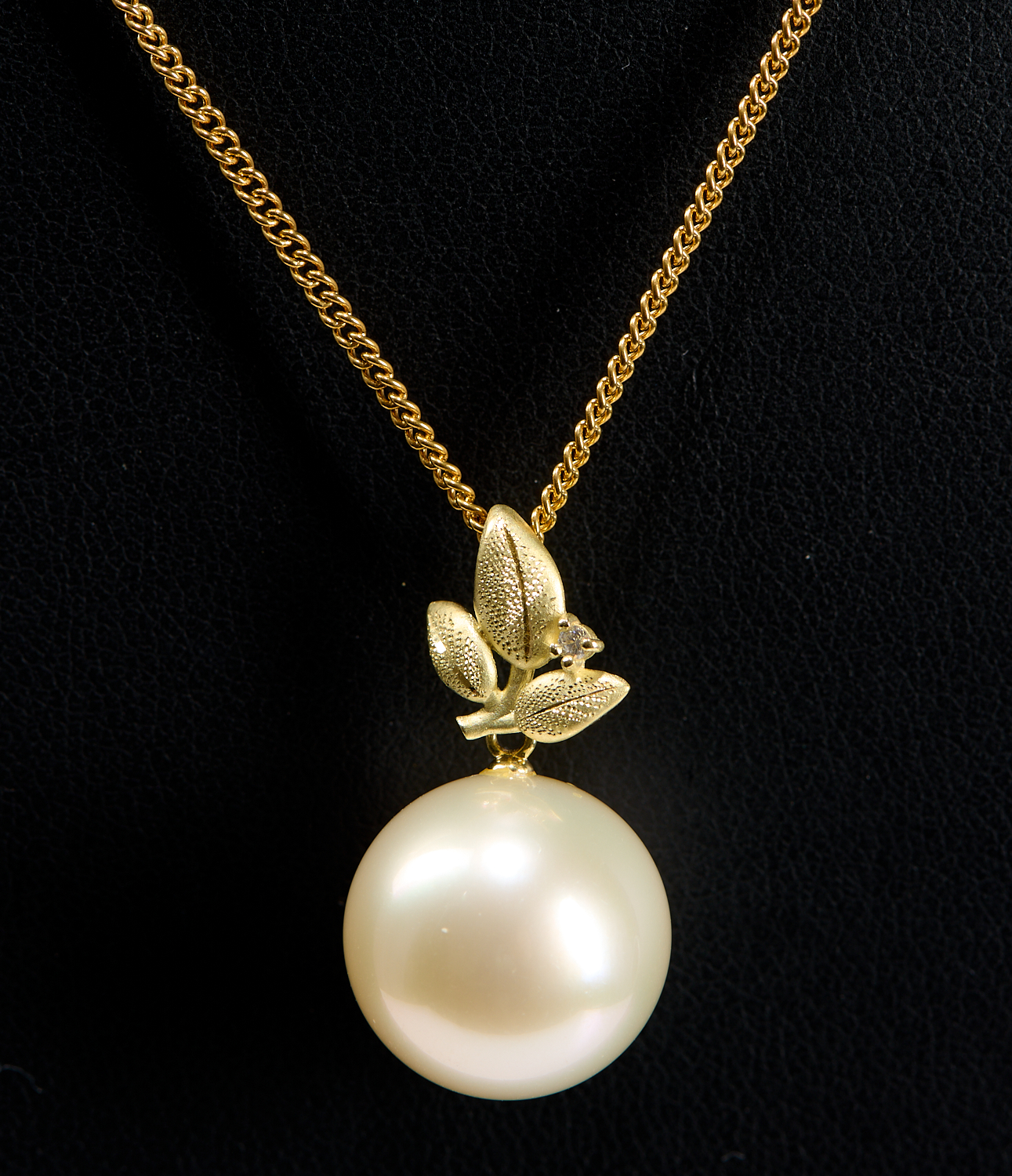 A SOUTH SEA PEARL AND DIAMOND PENDANT IN 18CT GOLD, THE ROUND PEARL MEASURING 14MM