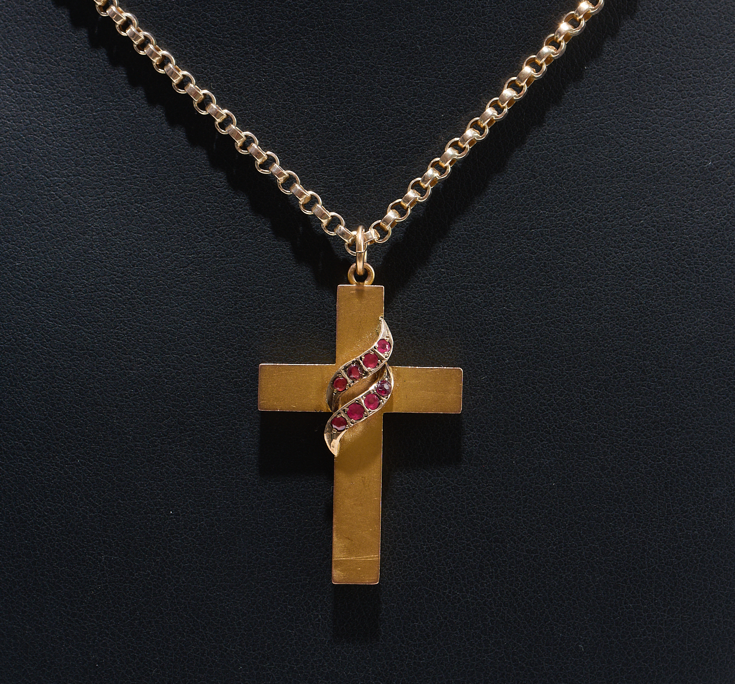 A STONE SET CROSS PENDANT AND CHAIN IN 9CT GOLD BY ARONSON, LENGTH APPROXIMATELY 520MM, 8.69GMS