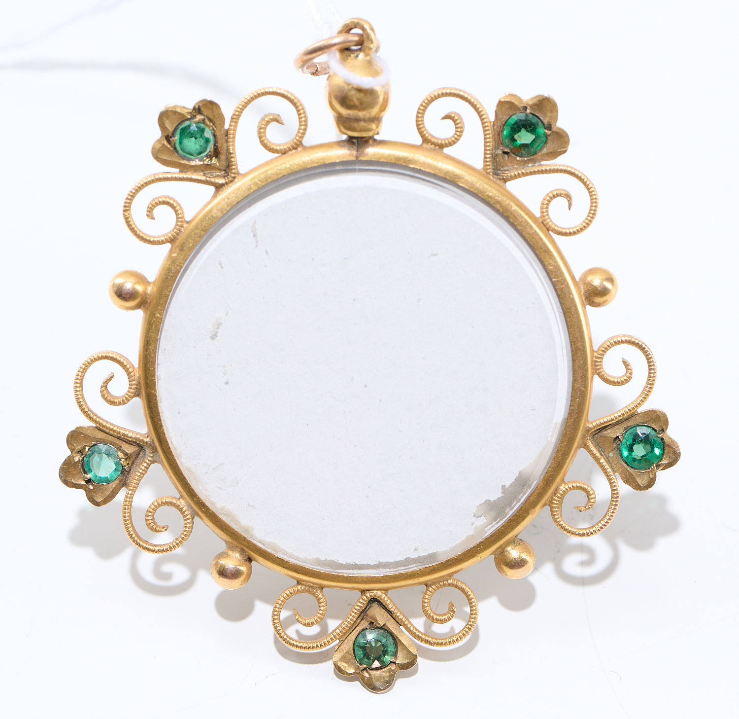 A GREEN PASTE SET LOCKET PENDANT IN LOW CARAT GOLD BY ROLLASON, DIAMETER 30MM