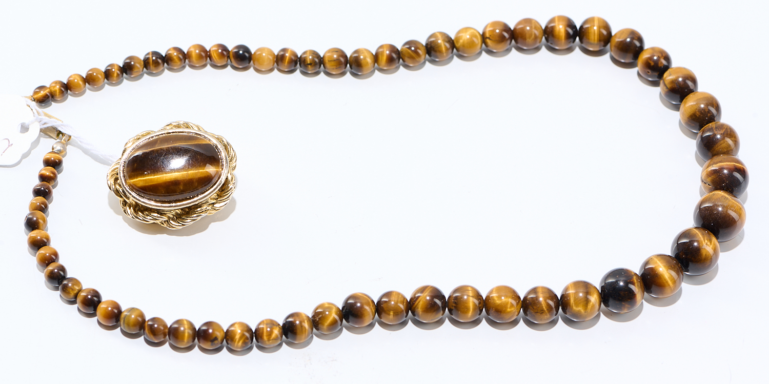 A TIGERS EYE BEADED NECKLACE AND BROOCH