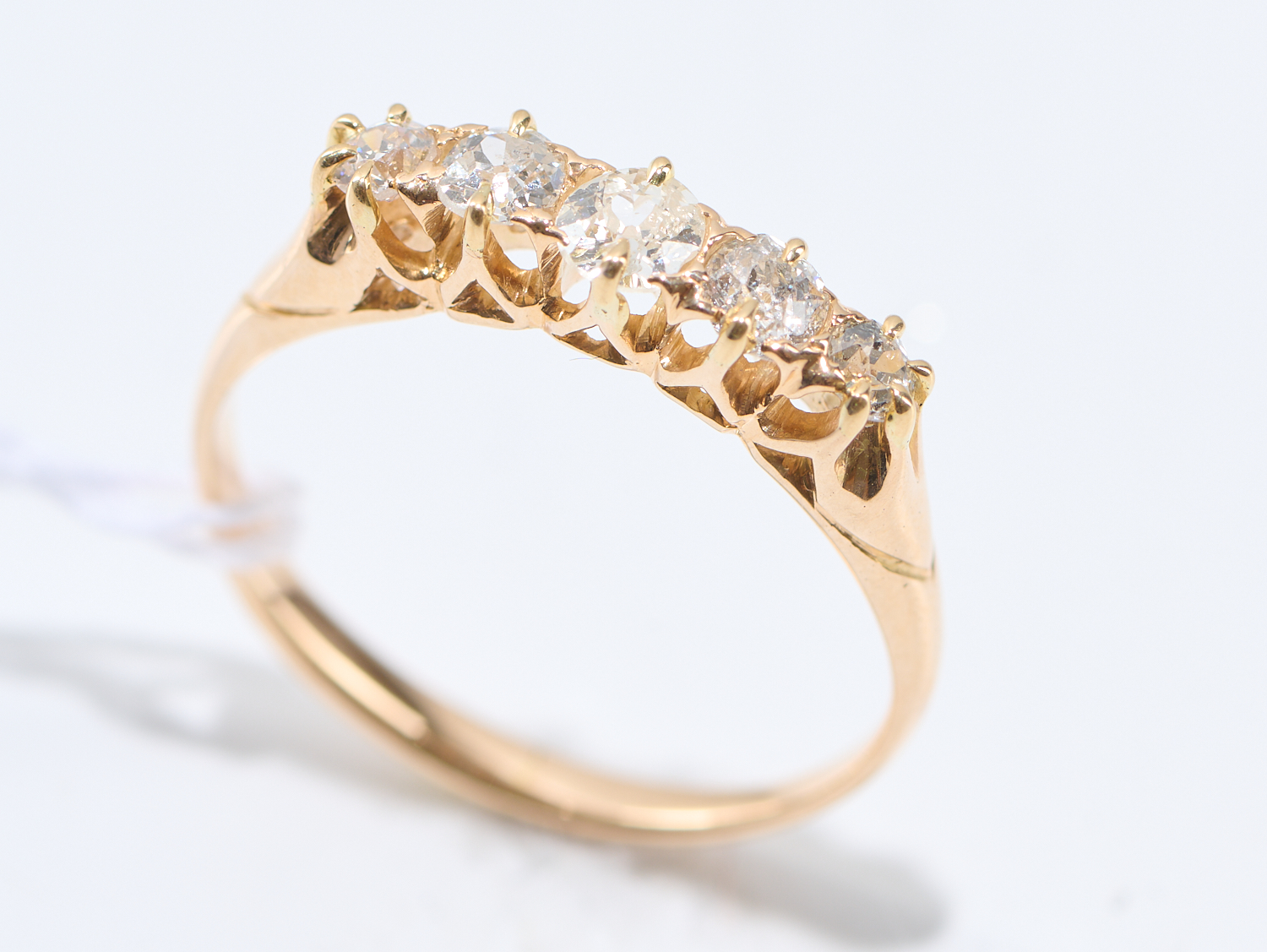A VICTORIAN STYLE DIAMOND SET RING IN 14CT GOLD, THE FIVE OLD EUROPEAN CUT DIAMONDS TOTALLING 0.60CTS, RING SIZE P, 2.6GMS