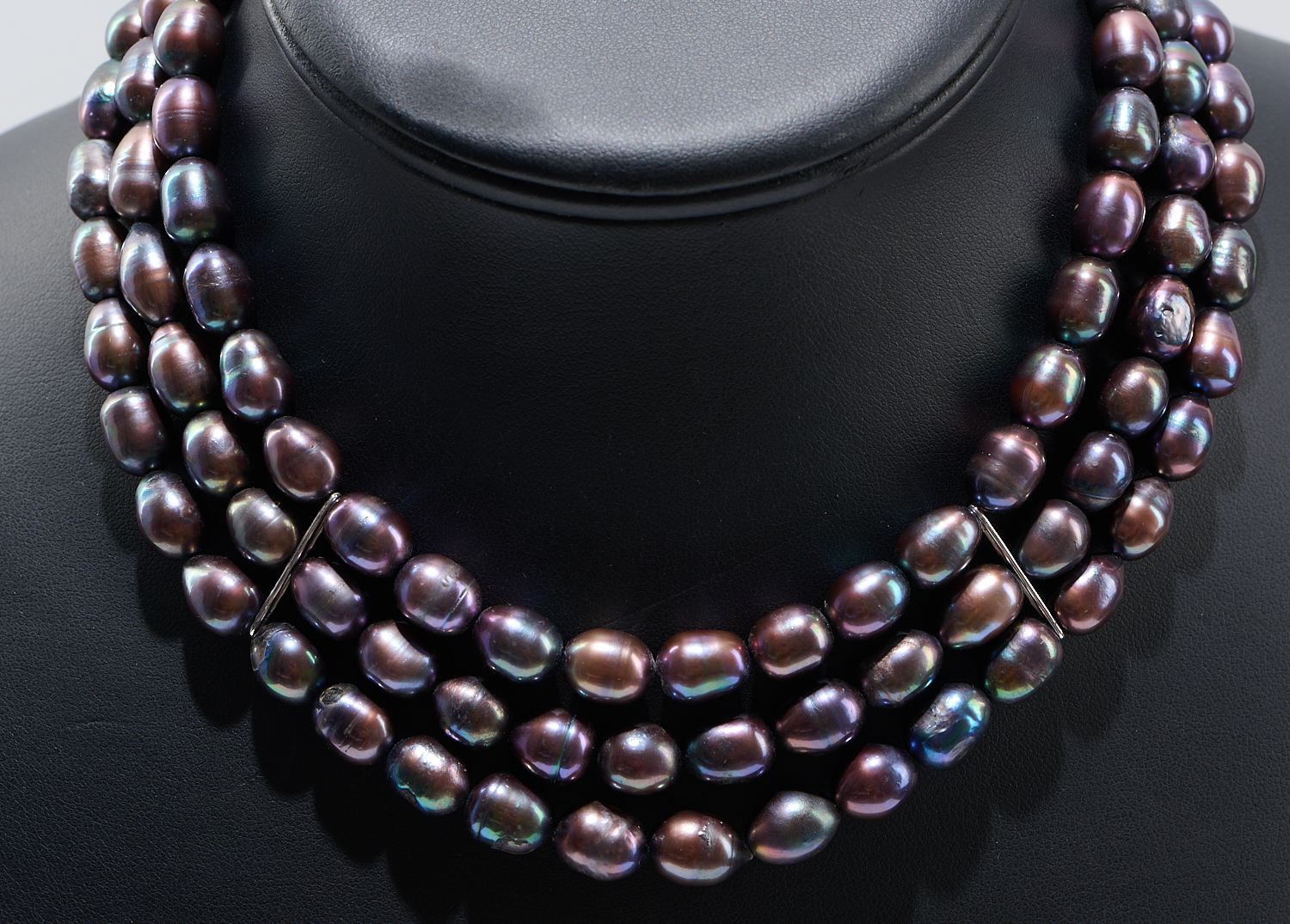 A TRIPLE STRAND OF FRESH WATER PEARLS NECKLACE TO A 14CT WHITE GOLD CLASP, APPROXIMATE LENGTH 370MM
