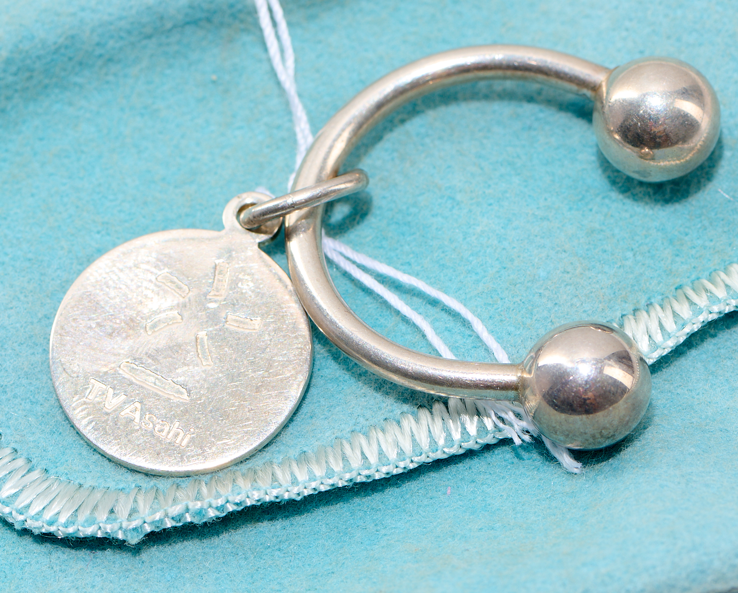 A TIFFANY & CO SILVER KEY RING WITH CIRCULAR CHARM, BOX AND POUCH
