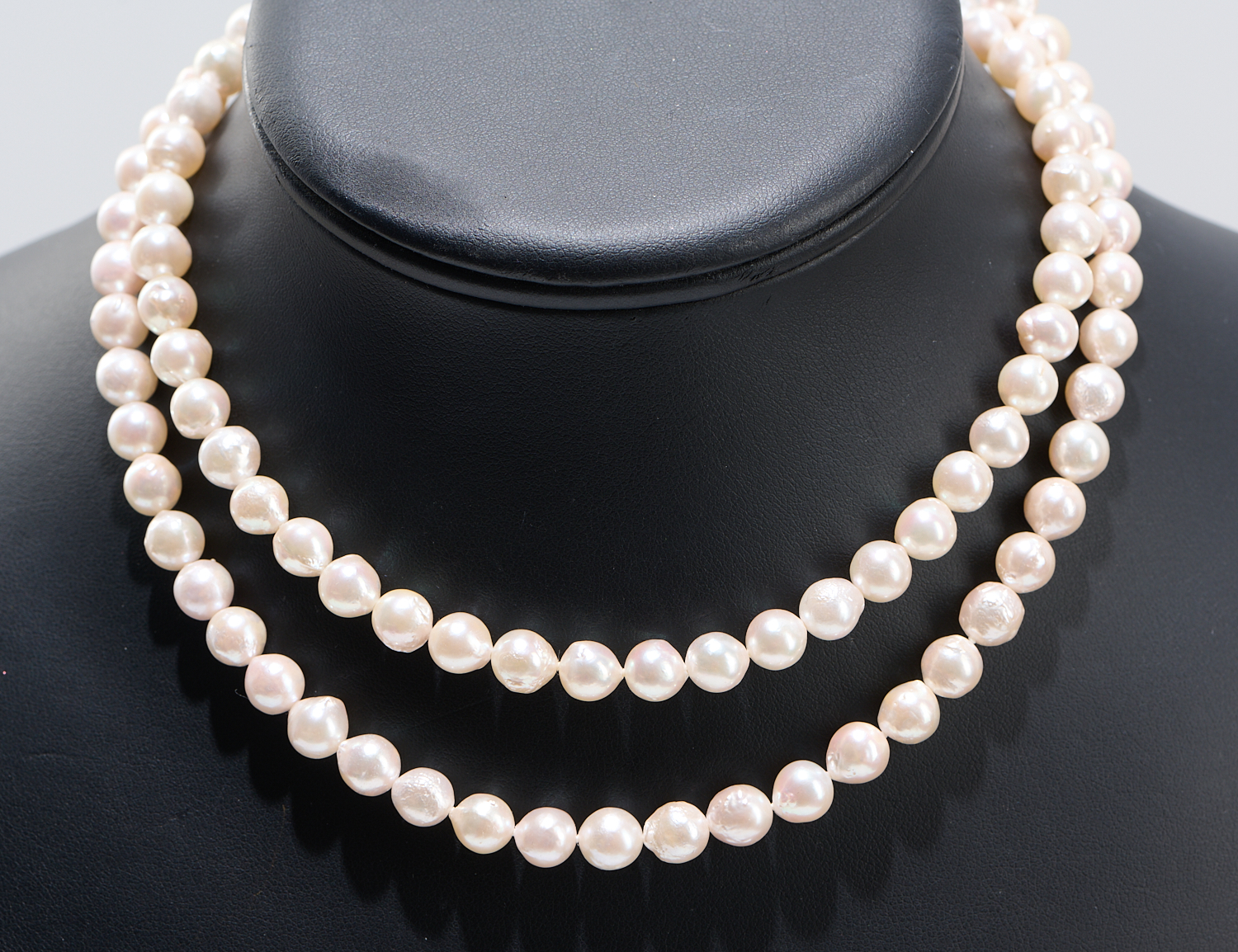 A PEARL SET OPERA LENGTH NECKLACE, WITH FITTINGS IN 18CT GOLD