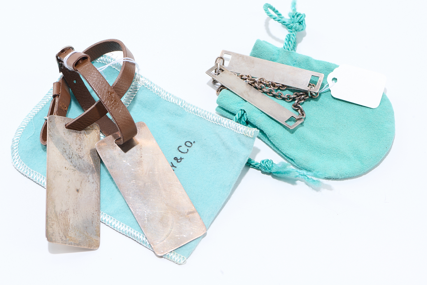 A PAIR OF TIFFANY & CO RECTANGULAR SILVER PLAQUES, WITH POUCH, AND A PAIR OF TIFFANY & CO SILVER AND LEATHER LUGGAGE TAGS, BOX AND POUCH