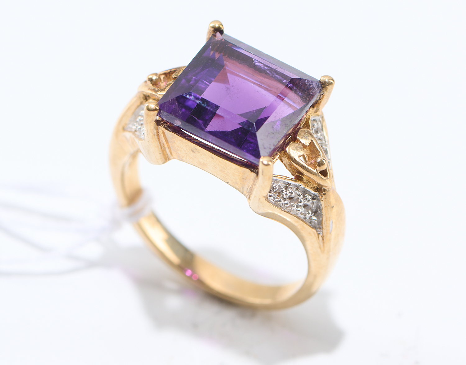 AN AMETHYST AND WHITE TOPAZ RING IN 9CT GOLD, RING SIZE N, 5.77GMS