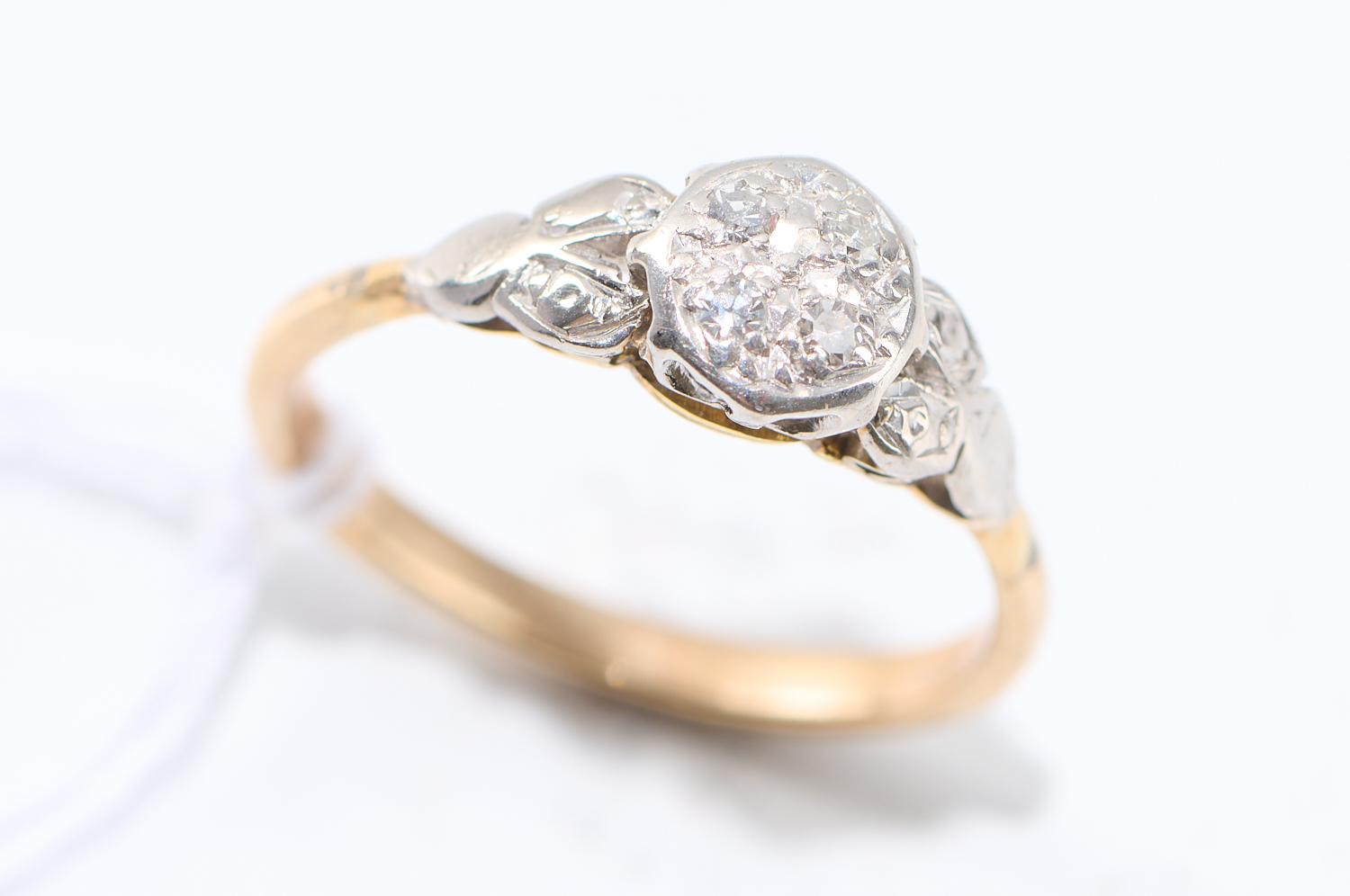 A DIAMOND CLUSTER RING IN 18CT GOLD. SIZE K 1/2