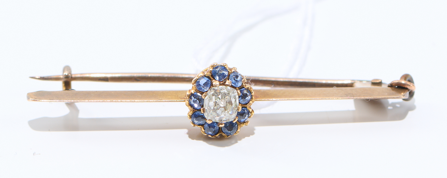 A SAPPHIRE AND DIAMOND BAR BROOCH IN 14CT GOLD, TOTAL LENGTH APPROXIMATELY 39MM, 2.10GMS