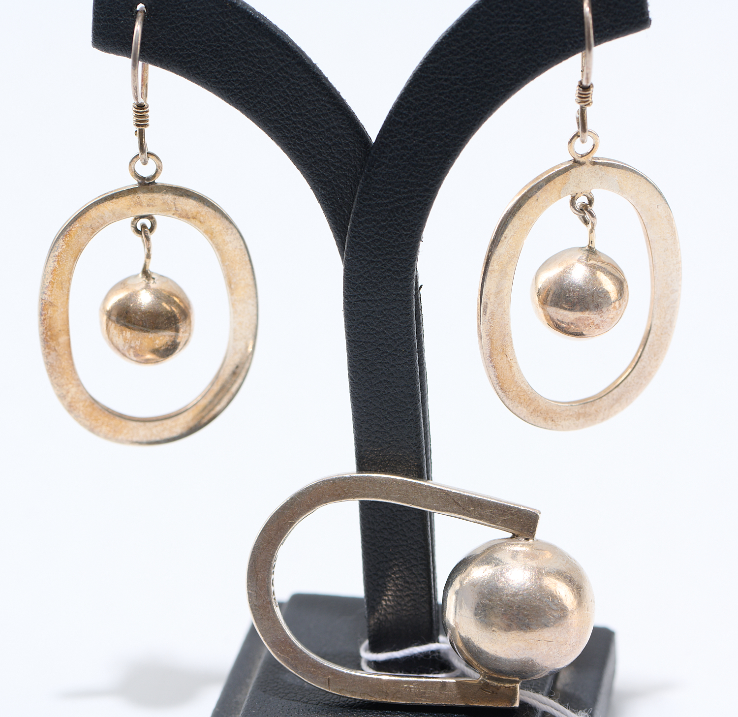 A PAIR OF SILVER SPHERE PENDANT EARRINGS AND SILVER SPHERE RING, RING SIZE O