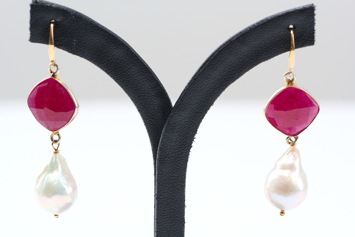 A PAIR OF DYED QUARTZ AND PEARL EARRING IN SILVER GILT TO 18CT SHEPHERD HOOK FITTINGS