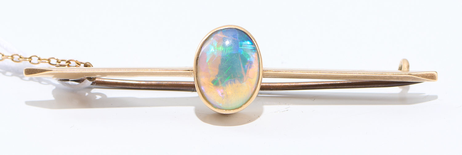 AN OPAL BAR BROOCH IN 15CT GOLD, LENGTH APPROXIMATELY 53MM