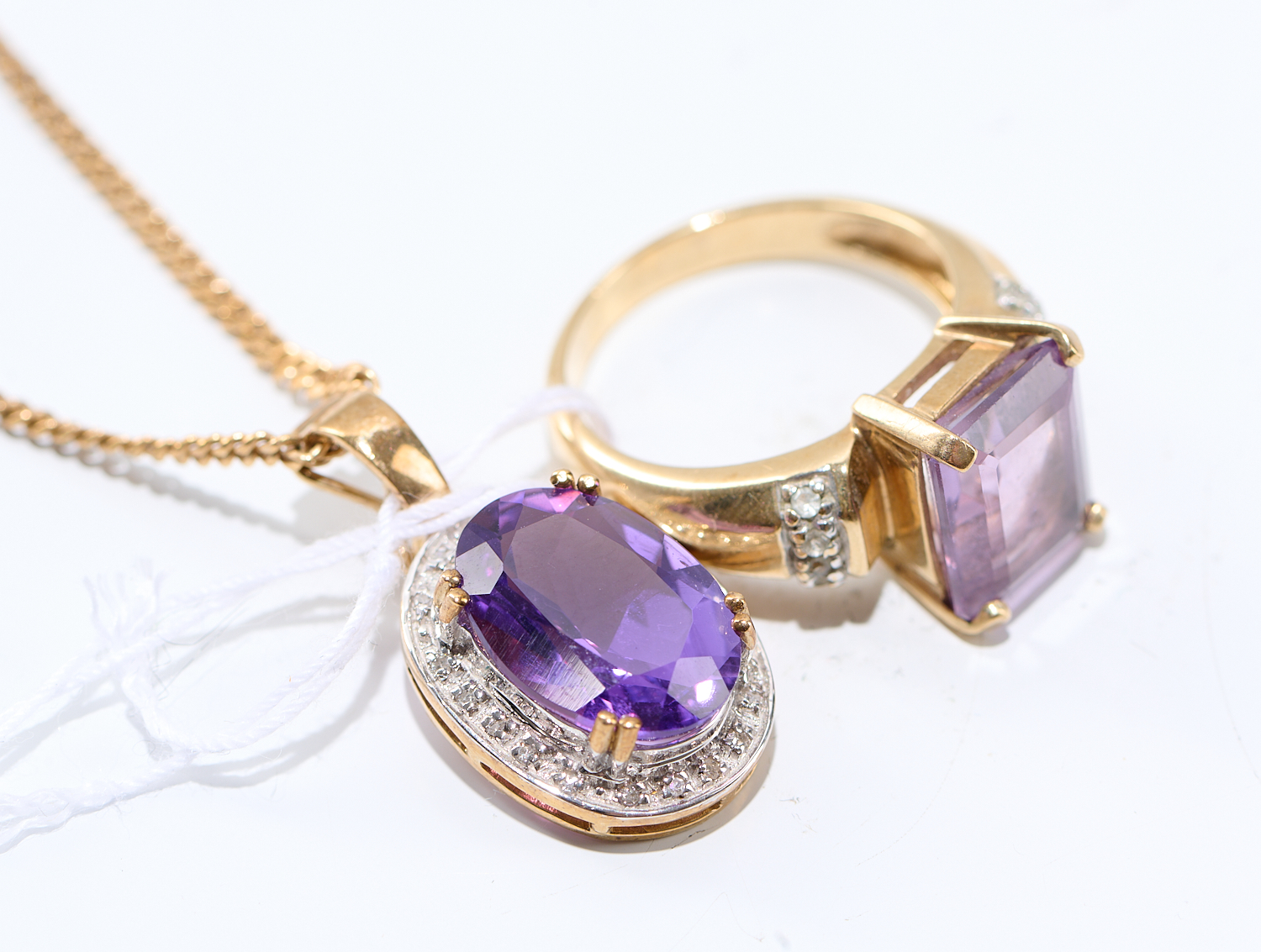 AN AMETHYST RING AND PENDANT IN 9CT GOLD, RING SIZE M 1/2, NECKLACE LENGTH 390MM