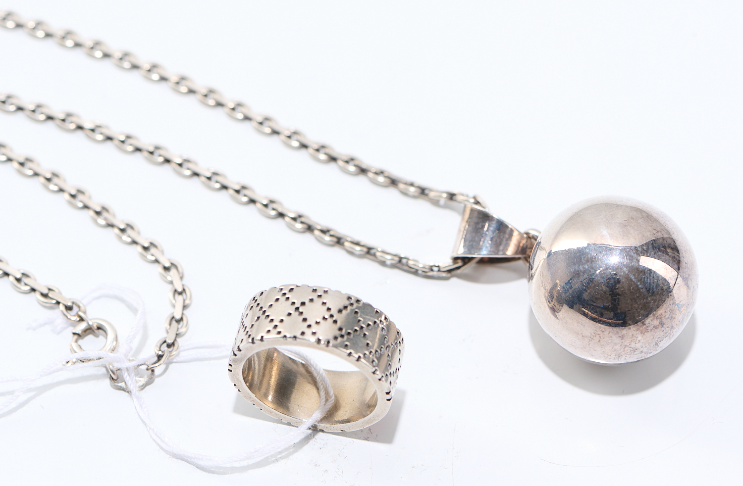 A VINTAGE RING BY GUCCI, SIZE K 1/2, AND A 925 STAMPED SILVER RATTLE SPHERE NECKLACE, LENGTH 440MM
