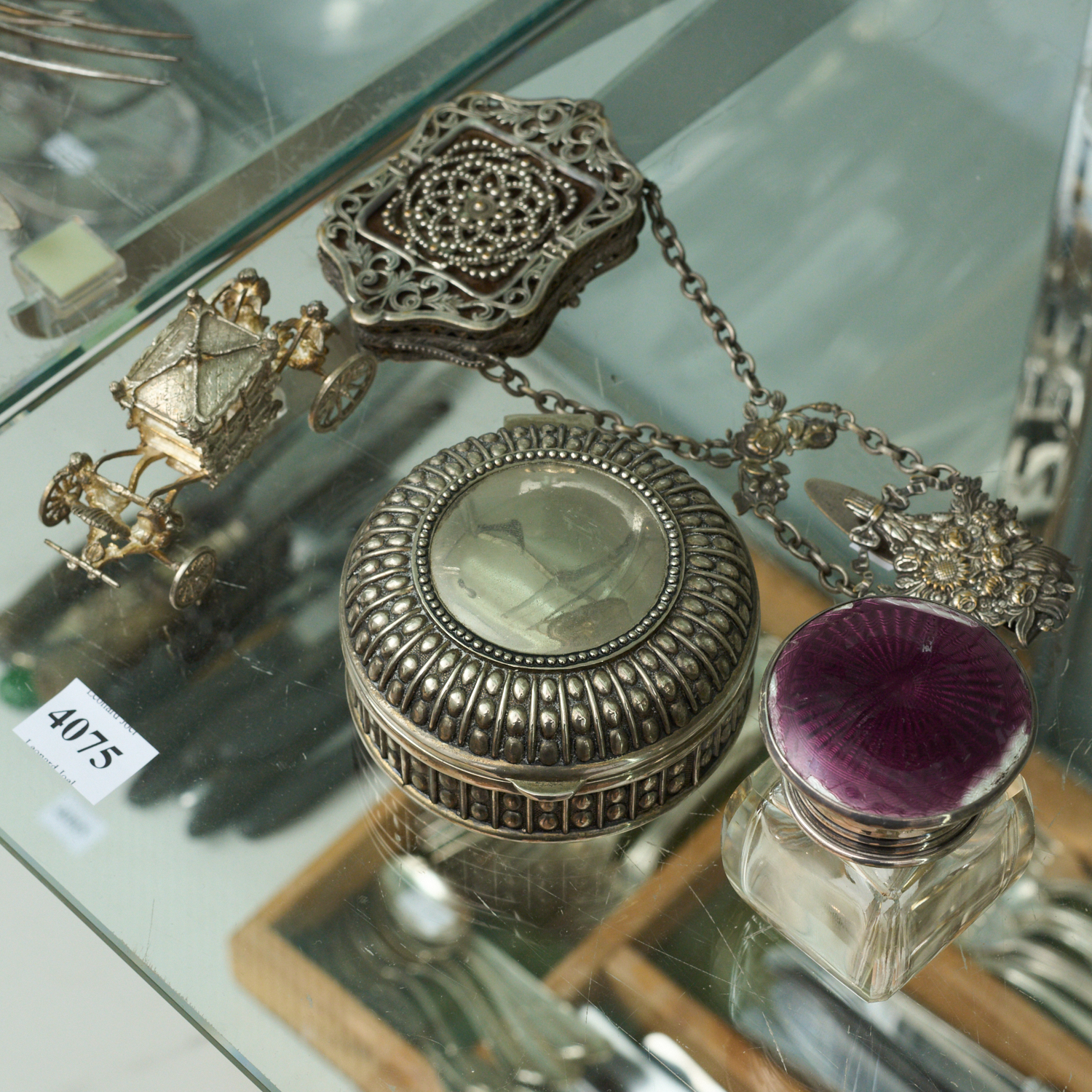 STERLING SILVER CORONATION COACH TOGETHER WITH GUILLOCHE ENAMEL LIDDED BOTTLE, SILVERPLATE BOX AND CHANTELAINE PURSE, LEONARD JOEL LOCAL DELIVERY SIZE: SMALL