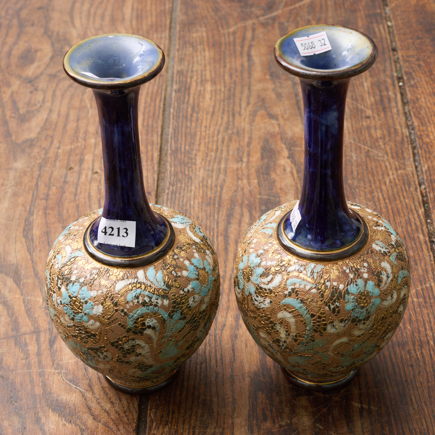 A PAIR OF VICTORIAN ROYAL DOULTON VASES H.26CM, LEONARD JOEL LOCAL DELIVERY SIZE: SMALL