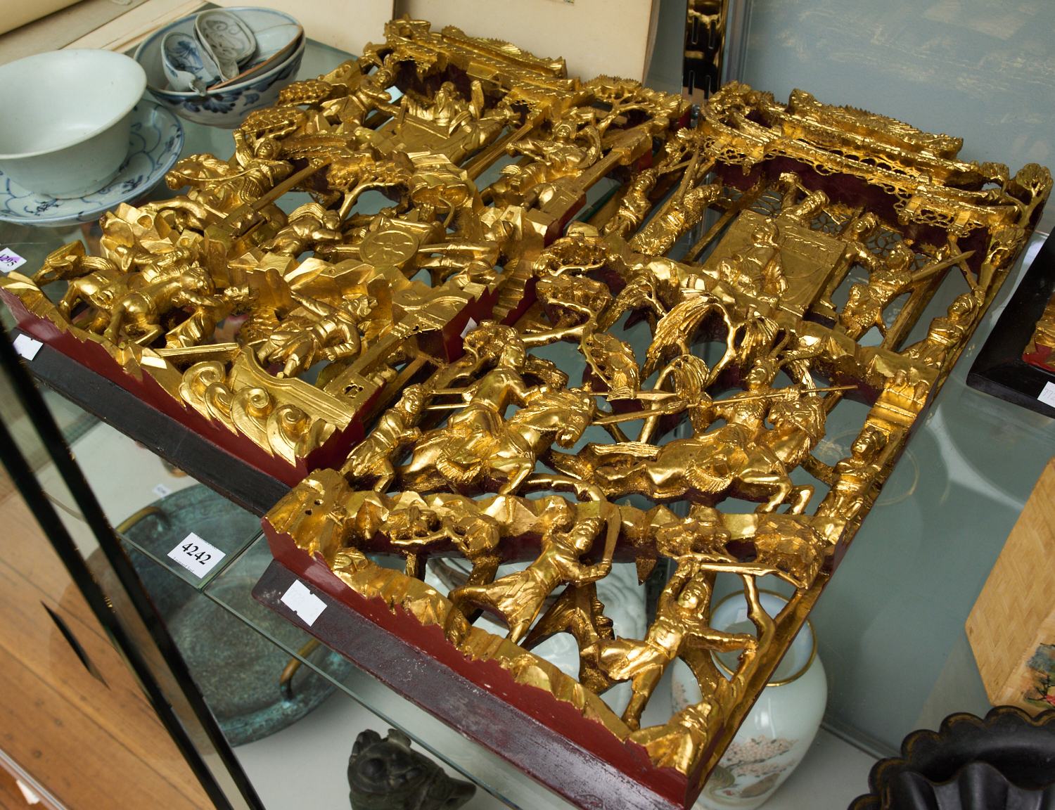 TWO CHINESE GILT WOOD CARVINGS H.49CM (LARGEST), LEONARD JOEL LOCAL DELIVERY SIZE: SMALL