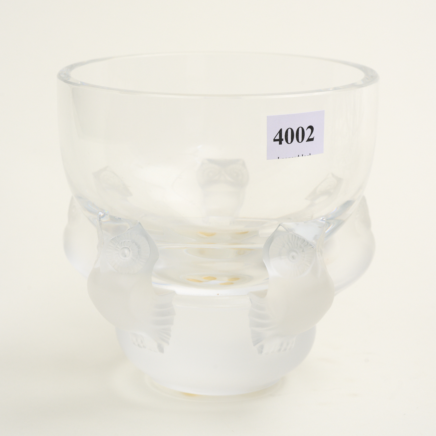 A LALIQUE BOWL WITH OWL DECORATIONS DIA.13.5CM, LEONARD JOEL LOCAL DELIVERY SIZE: SMALL