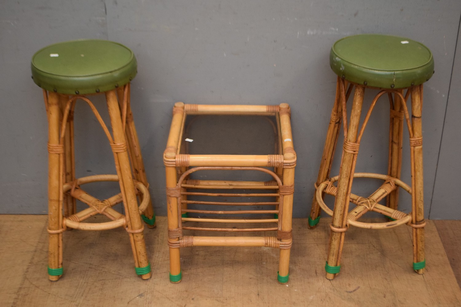 A PAIR OF MID CENTURY CANE STOOLS TOGETHER WITH SIDE TABLE ( 71H X 34 DAIMETER CM) (LEONARD JOEL DELIVERY SIZE: LARGE)