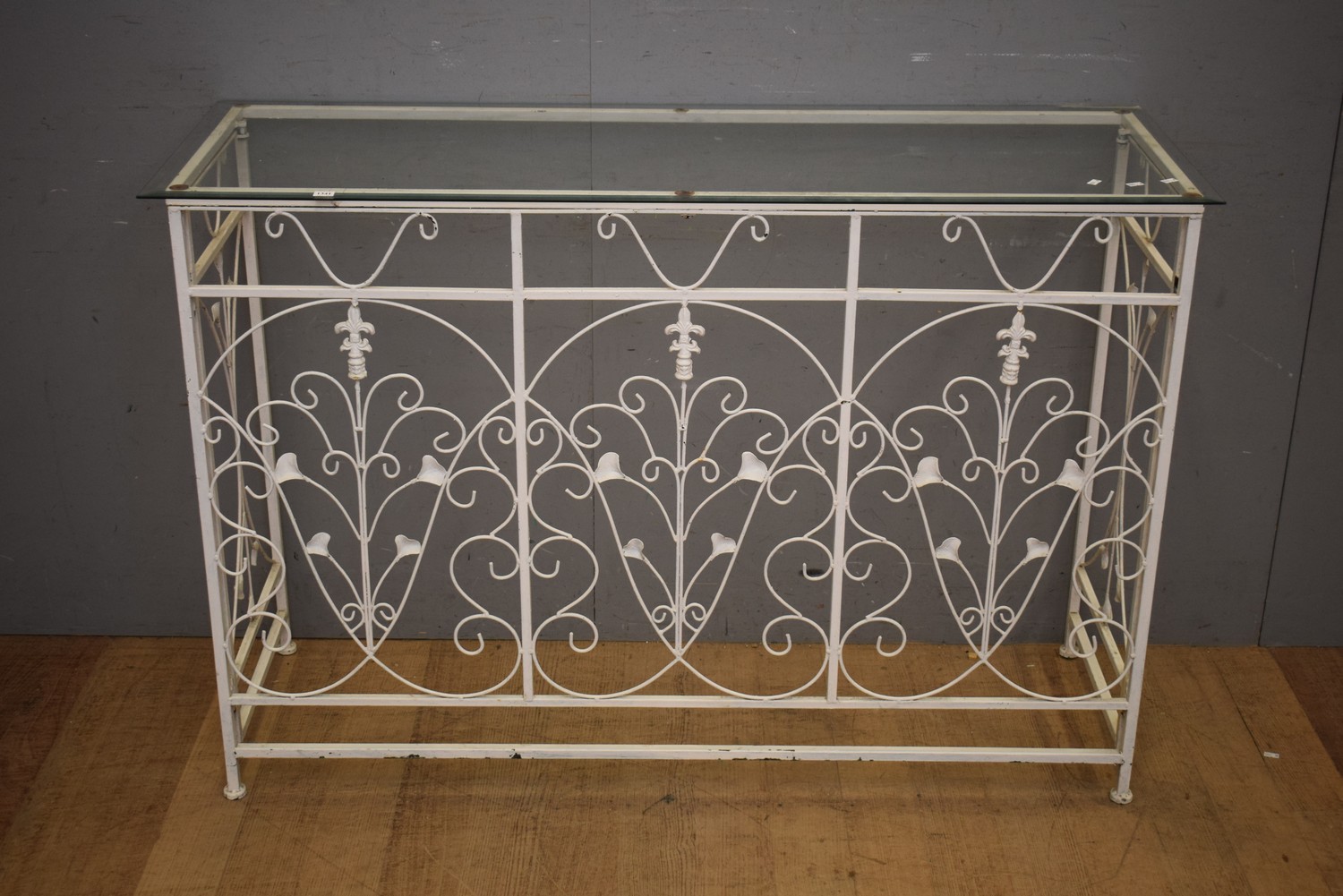 A DECORAIVE METAL CONSOLE WITH GLASS TOP (A/F) (91H x 135W x 48D CM) (LEONARD JOEL DELIVERY SIZE: LARGE)