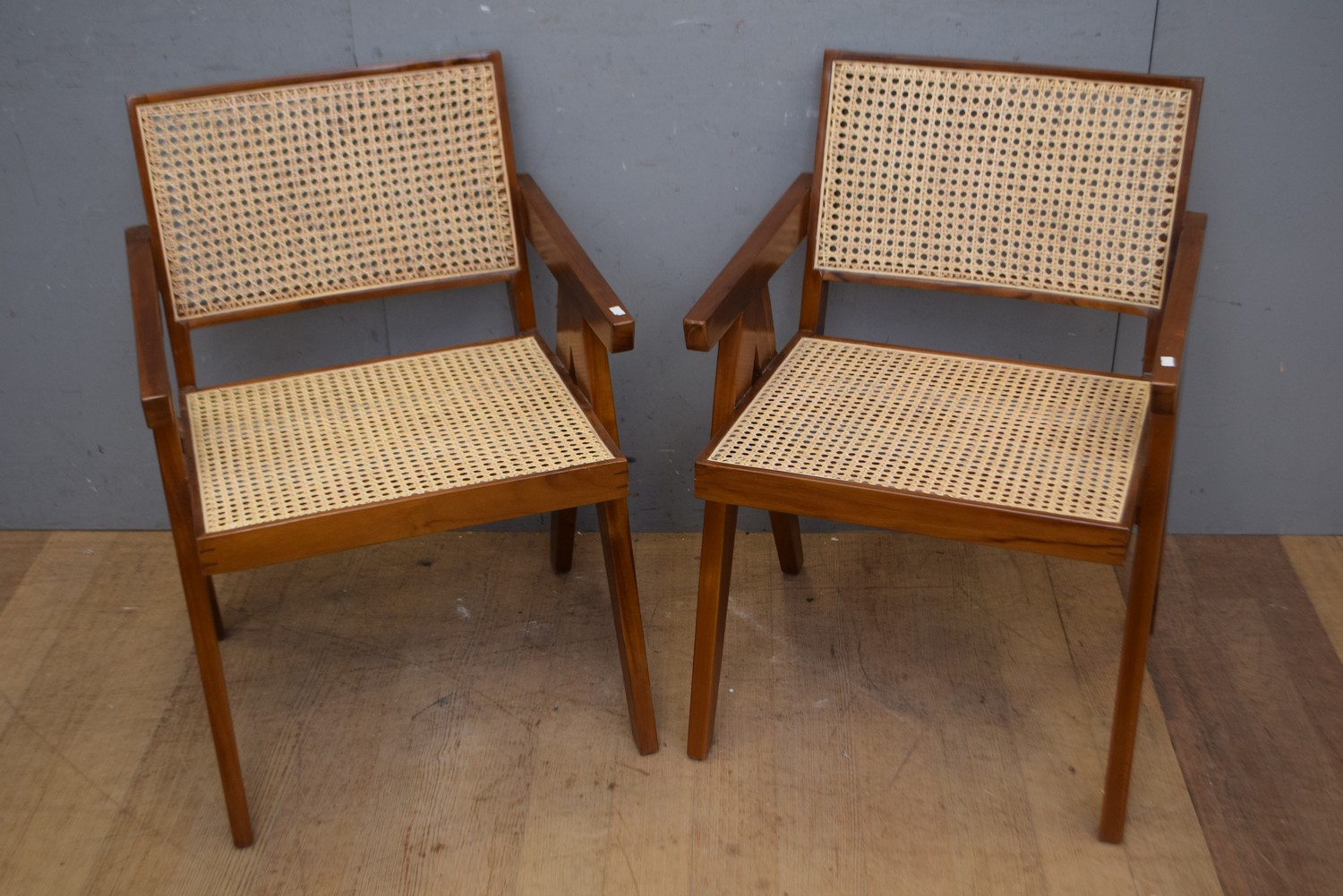 A PAIR OF TEAK AND RATTAN SIDE CHAIRS ( 81H X 56W X 61D CM) (LEONARD JOEL DELIVERY SIZE: LARGE)