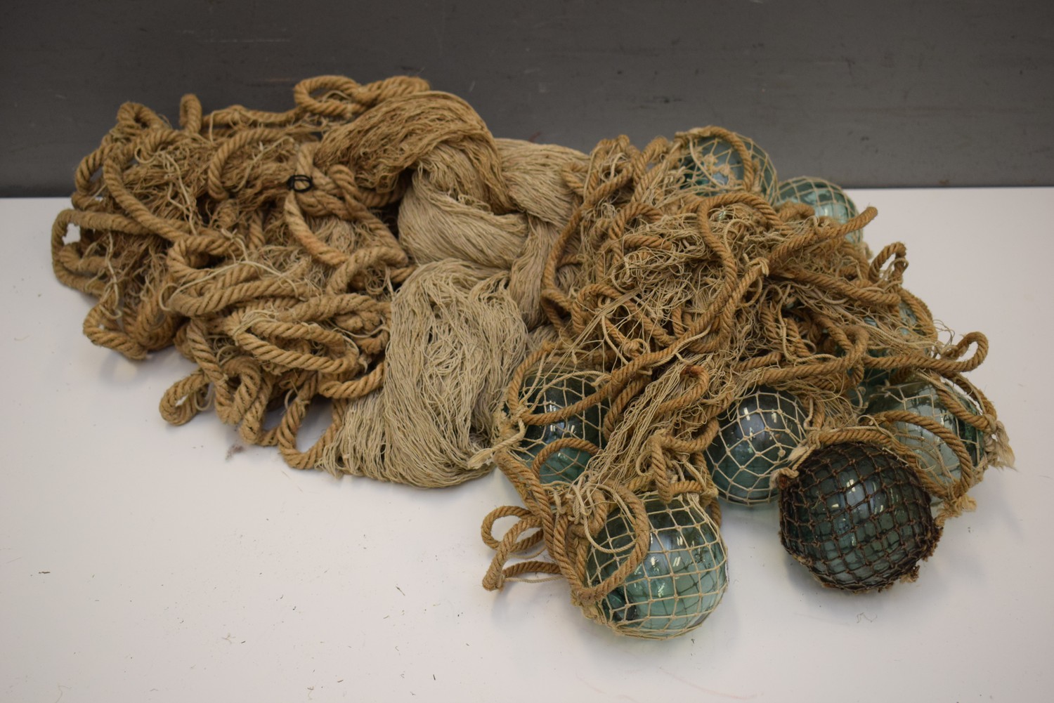 COLLECTABLE 1920S NATURAL FIBRE FISHING NET WITH 10 GLASS FLOATS (LEONARD JOEL DELIVERY SIZE: MEDIUM)