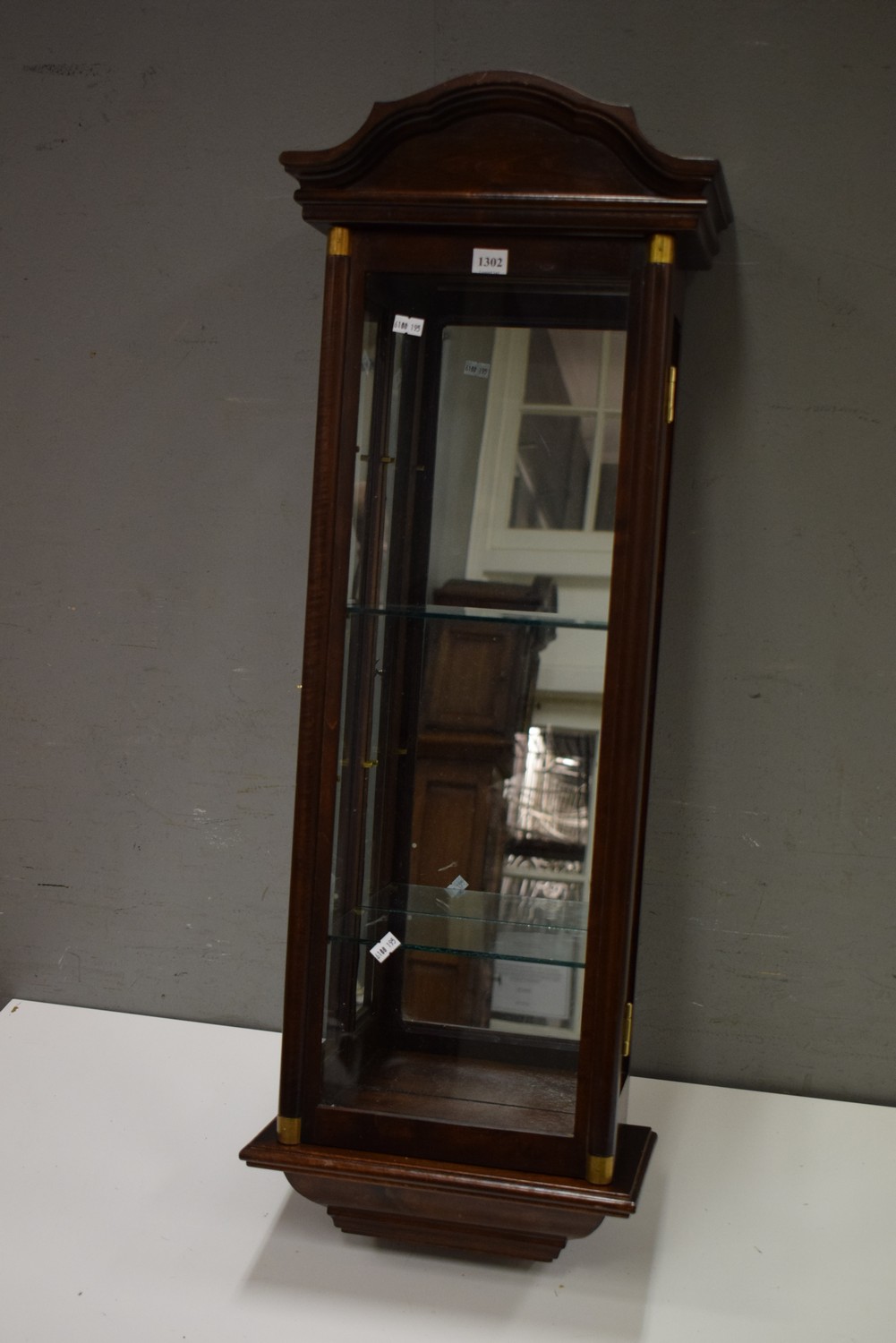 A WOODEN AND GLASS BRASS BOUND WALL MOUNT DISPLAY CABINET WITH 2 SHELVES (88H x 32W x 19D CM)