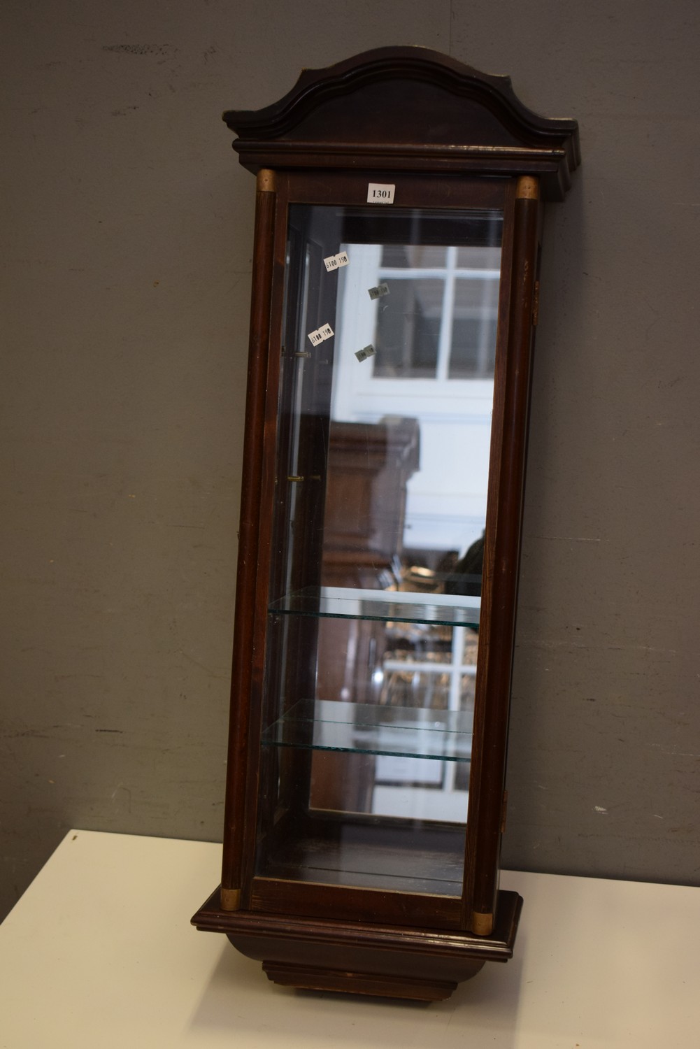 A WOODEN AND GLASS BRASS BOUND WALL MOUNT DISPLAY CABINET WITH 2 SHELVES (92H x 32W x 18D CM)