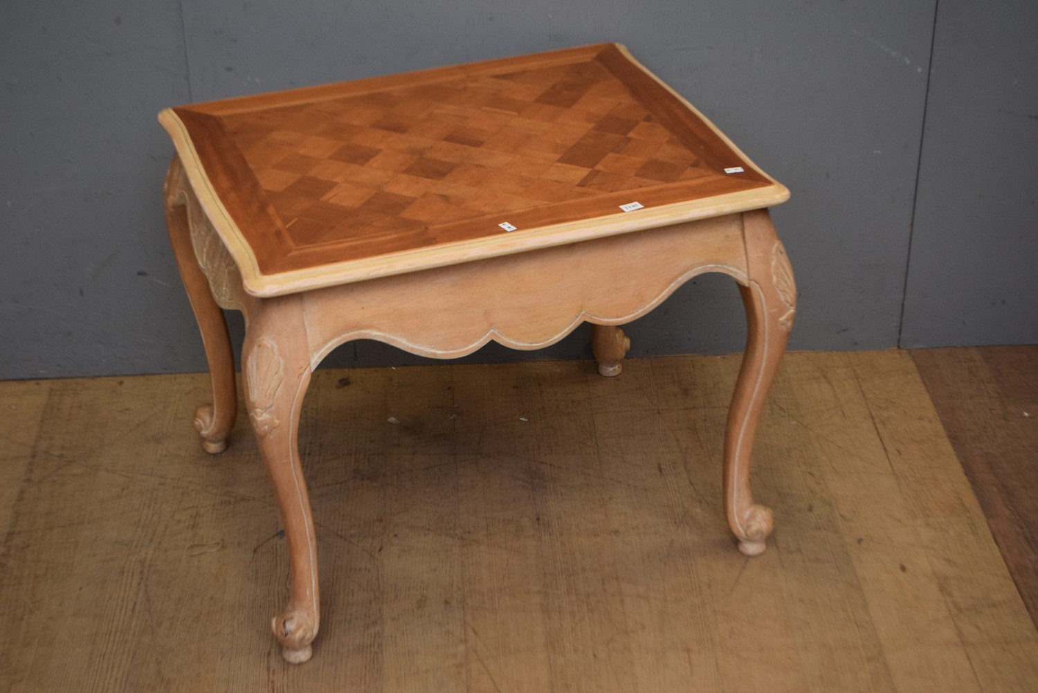 A FRENCH PROVINCIAL STYLE SOLID WOODEN PARQUETRY TOPPED COFFEE TABLE WITH RETRACTABLE SLIDE (56H x 70W x 56D CM) (LEONARD JOEL DELIVERY SIZE: LARGE)