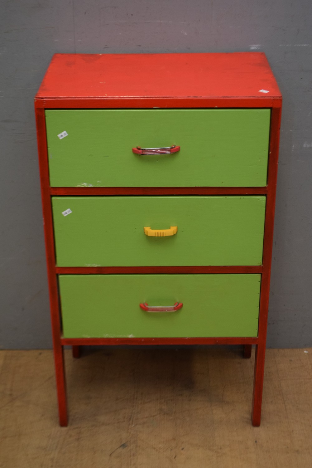A RETRO 1950S WOODEN THREE DRAWER PAINTED CABINET WITH BAKELITE HANDLES (A/F) (97H X 56W X 38D CM) (LEONARD JOEL DELIVERY SIZE: LARGE)
