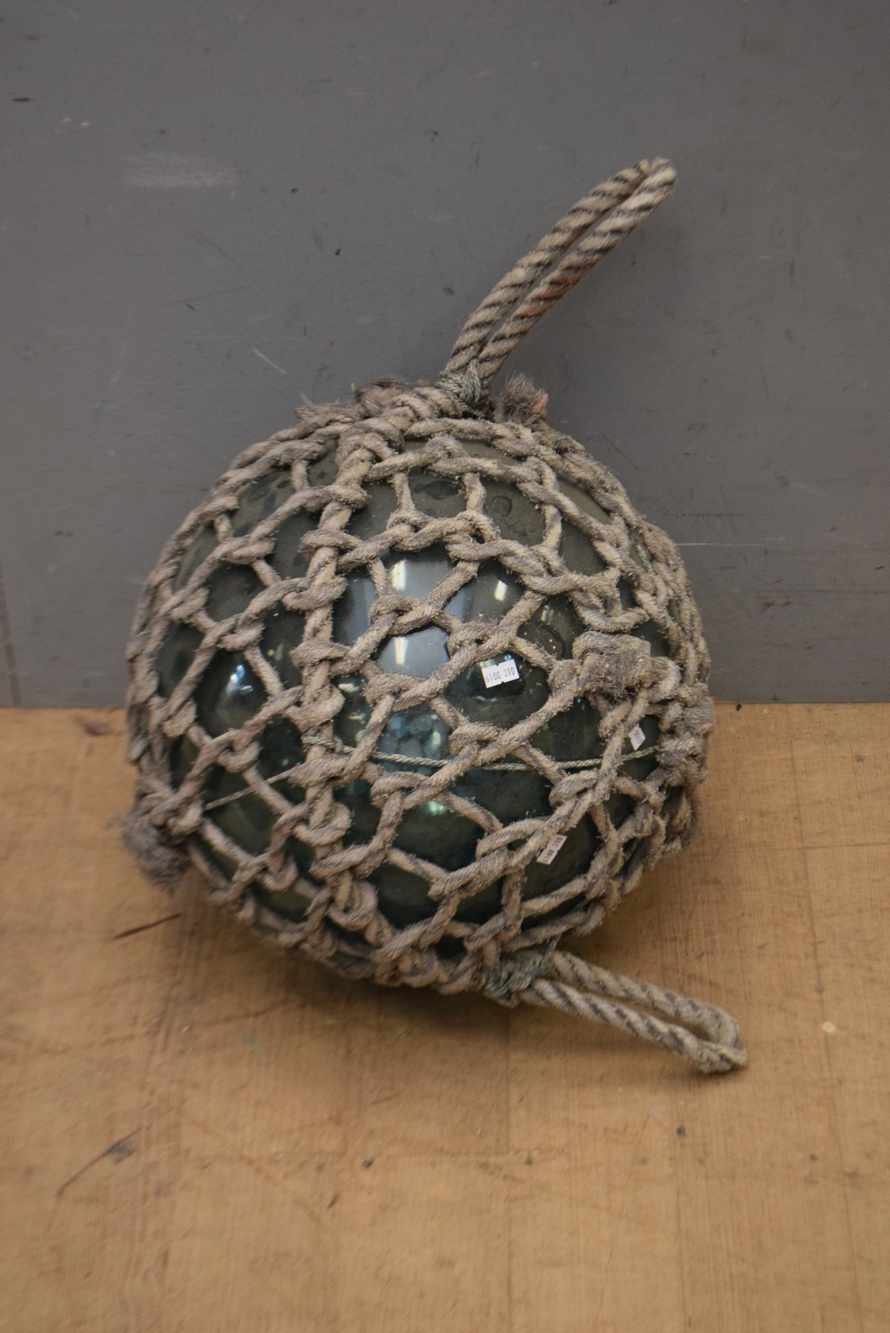 A FIBRE MOUNTED GREEN GLASS SHIPS BUOY FLOAT ( 37 DIAMETER CM) (LEONARD JOEL DELIVERY SIZE: MEDIUM)