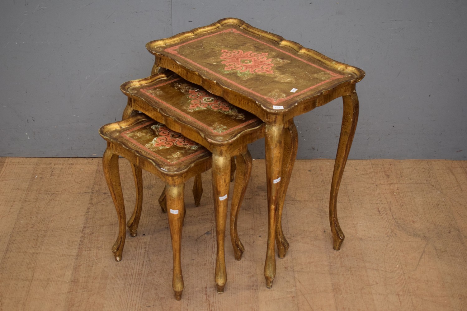 NEST OF ITALIAN GILTWOOD FLORENTINE SIDE TABLES WITH PINK DETAILING (58H x 60W x 36D CM) (LEONARD JOEL DELIVERY SIZE: MEDIUM)