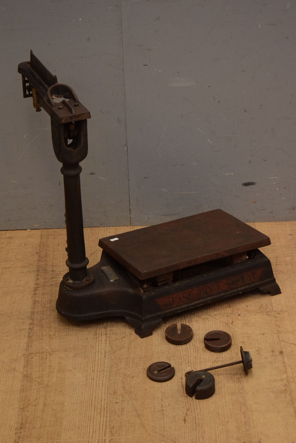 1900S SOLID CAST IRON AND BRASS PLATFORM SCALES WITH ORIGINAL PAINT AND WEIGHTS (A/F) (THIS HEAVY ITEM MUST BE REMOVED BY CARRIERS AT THE CUSTOMER'S EXPENSE. LEONARD JOEL STAFF CANNOT ASSIST CARRYING THIS ITEM) (X-LARGE ITEM)