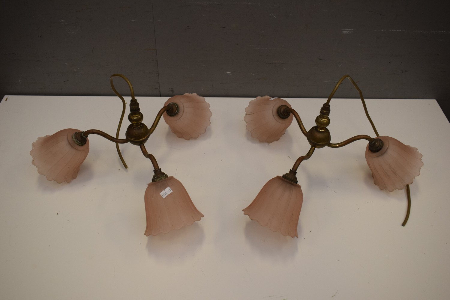A PAIR OF BRASS AND PINK GLASS LIGHT FITTINGS (A/F) (22H x 42D CM) (LEONARD JOEL DELIVERY SIZE: MEDIUM)