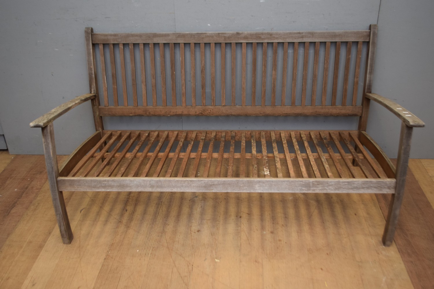 A TEAK OUTDOOR BENCH SEAT (A/F) ( 86H X 165W X 85D CM) (LEONARD JOEL DELIVERY SIZE: LARGE)