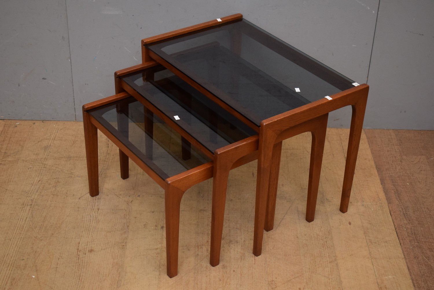 A MID CENTURY NEST OF TABLES WITH SMOKED GLASS TOP (48H x 64W x 41D CM) (LEONARD JOEL DELIVERY SIZE: MEDIUM)