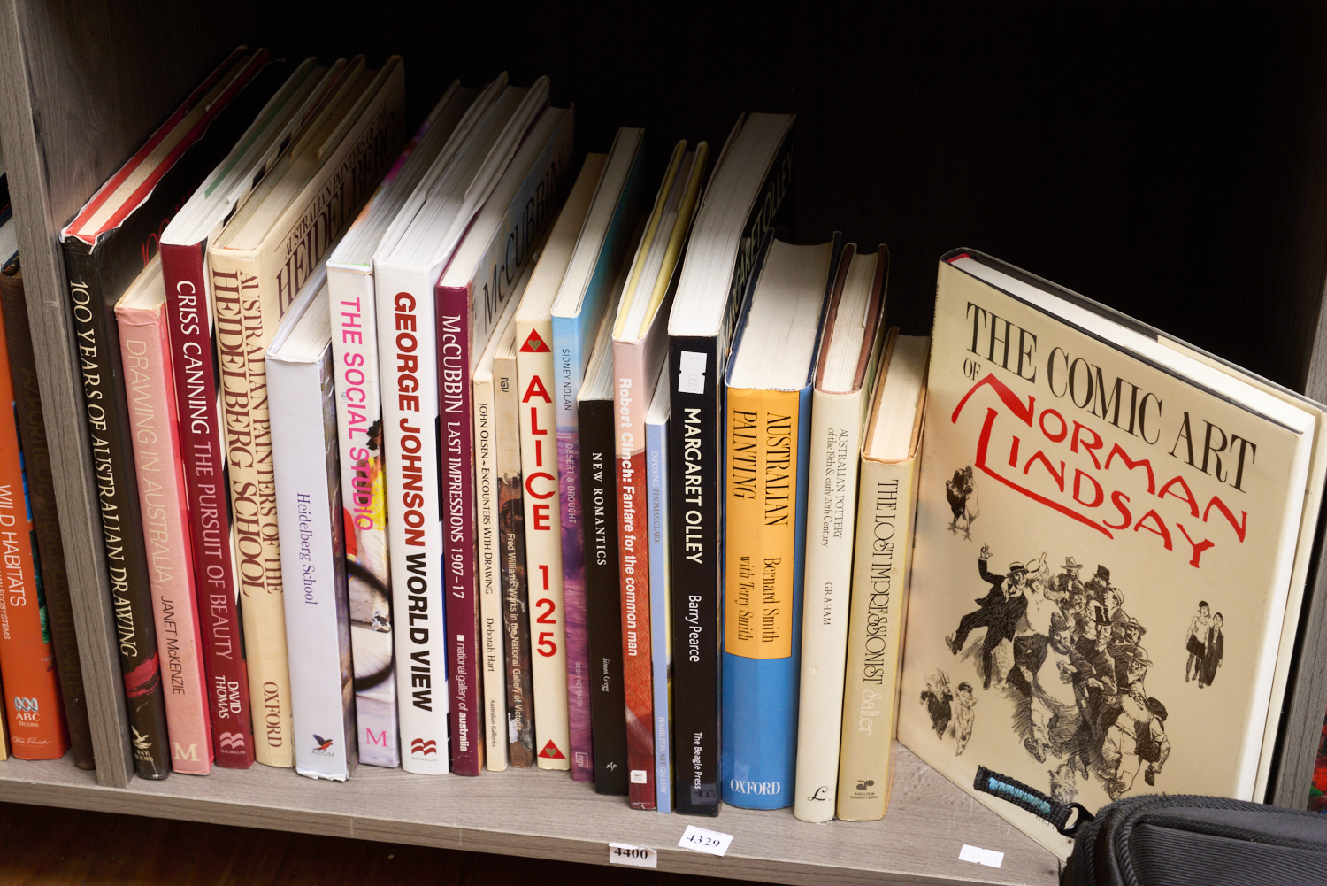 A SHELF OF AUSTRALIAN ART REFERENCE INCLUDING CRISS CANNING 'THE PURSUIT OF BEAUTY'; KEITH WINGROVE 'THE COMIC ART OF NORMAN LINDSAY' (1ST EDITION 1987); GEORGE JOHNSON 'WORLD VIEW'; BARRY PEARCE 'MARGARET OLLEY', LEONARD JOEL LOCAL DELIVERY SIZE: SMALL