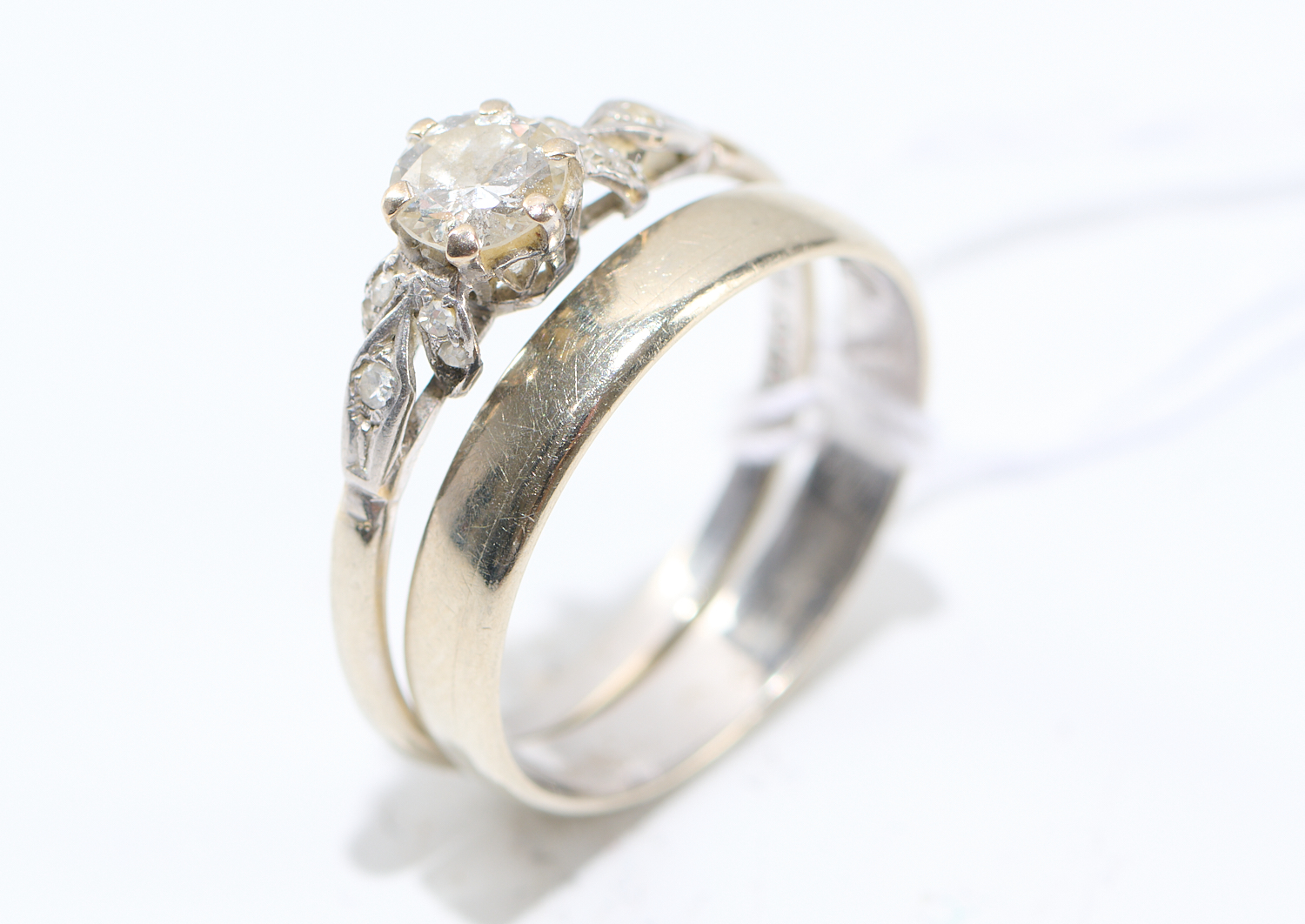 A DIAMOND RING IN PLATINUM STAMPED CATANACH AND A 18CT WHITE GOLD BAND, MAKERS MARK A.B. BOTH SIZE P