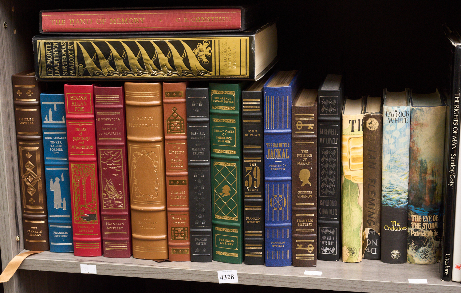 A SHELF OF VINTAGE LITERATURE INCLUDING IAN FLEMING'S 'DR NO' AND 'MAN WITH A GOLDEN GUN' , EDGAR ALLAN POE 'TALES OF MYSTERY & IMAGINATION' (FRANKLIN MYSTERY), F. SCOTT FITZGERALD (FRANKLIN LIBRARY), LE MORTE DARTHUR (STUDIO EDITIONS 1993), LEONARD JOEL LOCAL DELIVERY SIZE: MEDIUM
